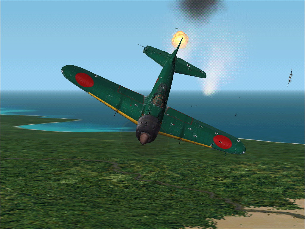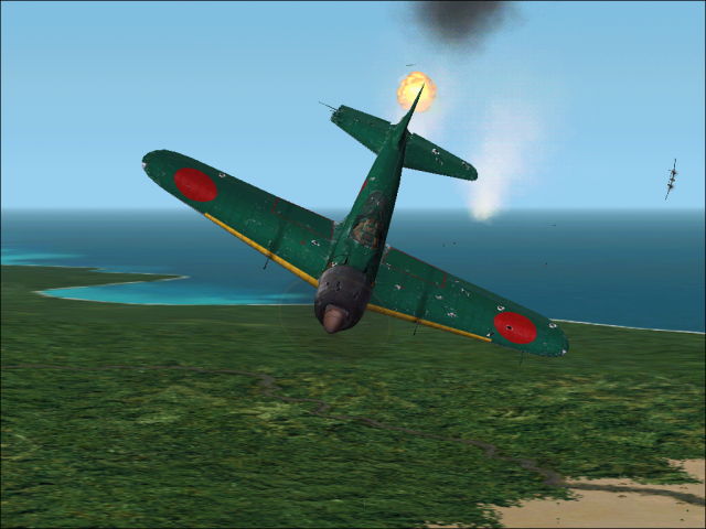 尾翼を打ち抜かれコントロールを失って墜落中の零戦52型です。 |