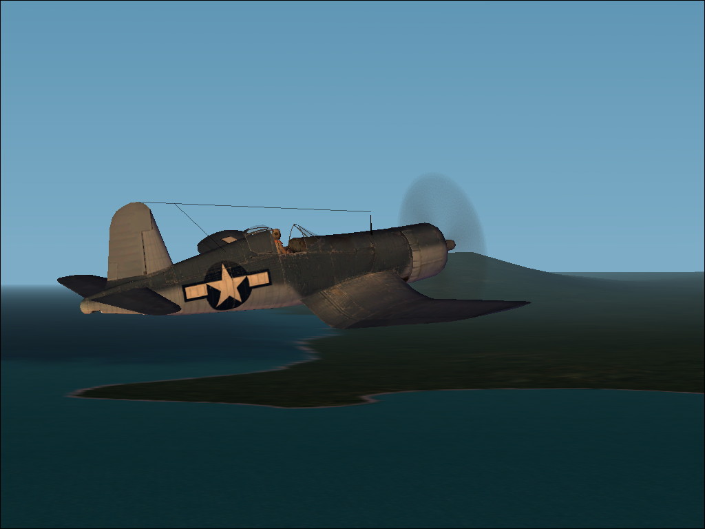 夕陽を浴びて飛行するF4Uコルセア。風防が開いているのにお気づきでしょうか。そう、デフォルトで登場する戦闘機はみな風防が開けるようになっているのです。バーチャルコックピットの視点でも風防の開閉はアニメーションで見られます。 |