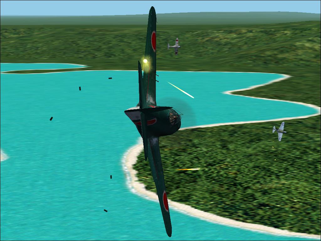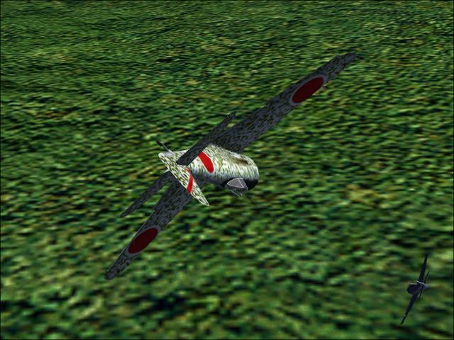敵を捕捉し、今まさに射撃せんとする隼。この機体はAI機専用です。ユーザーは選択できません。が、これらAI機専用機体をユーザーが使用可能にするためのパッケージがあちこちに転がっています。 |