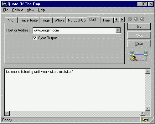 Quote of the day will connect to a quote server and return a random quote (also known as cookie). Quote of the day is typically supported by NT servers.