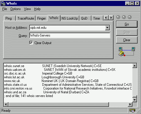 最新の whoisサーバのリストを得たいときは、queryに 'WhoIs-Servers'、ホストに 'sipb.mit.edu'と入力して使ってください。