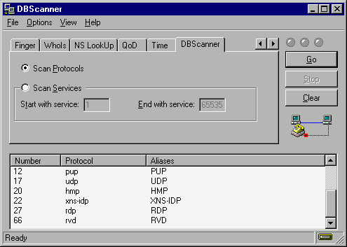 - Scan Services: Scan de winsock database for all available services. The scan can range from port (service) 1 through 65535. If you don't want to scan this complete range (time consuming) you can specify a different range.