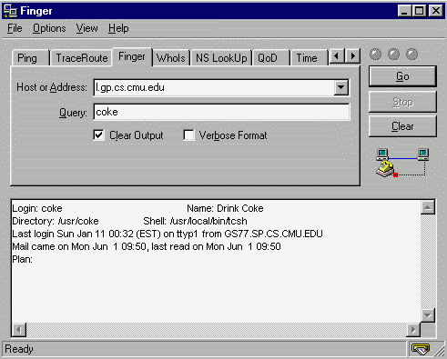 Fingerを使うと、emailアドレスを元にしてユーザの情報が得られます。一般には、Fingerは unixのホストでサポートしています。