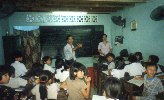 目指す施設は普通の民家の建物と変わらない平屋建ての、約7〜8坪の広さの教室である。着いた時はちょうど授業中で全部で8本の机に3人掛けで23人が座っていた。われわれが入ったと同時に、子供たちが一斉に立ちあがり歌(内容は良く分からないが)を唄って歓迎してくれた。Trang(チャーン)さんとHa(ハアー)さんという2人の女性が授業をされていた。われわれの質問にはおもにTrangさんが答えて頂いた。Trangさんは2年間ずっとここだけで教えていて、学校の授業と掛け持ちはしていない。