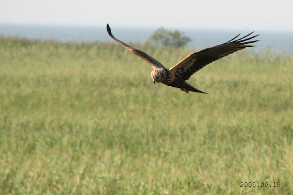 (2005/09 茨城県) トビより、ちょっとずんぐりした感じ? 低い位置を羽ばたきながら飛んでいるとあまり猛禽っぽくないけど、 すーっとX字飛行するとなかなかカッコいい。 (PowerShot S2 IS)