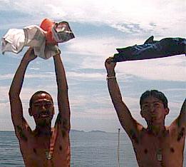 | 船内探索。 展望風呂に入る。 俺たちが104時間かけた道のりを フェリーは18時間で行く。 日記をつけ、旅のまとめをした後は 寝続けた。→ |